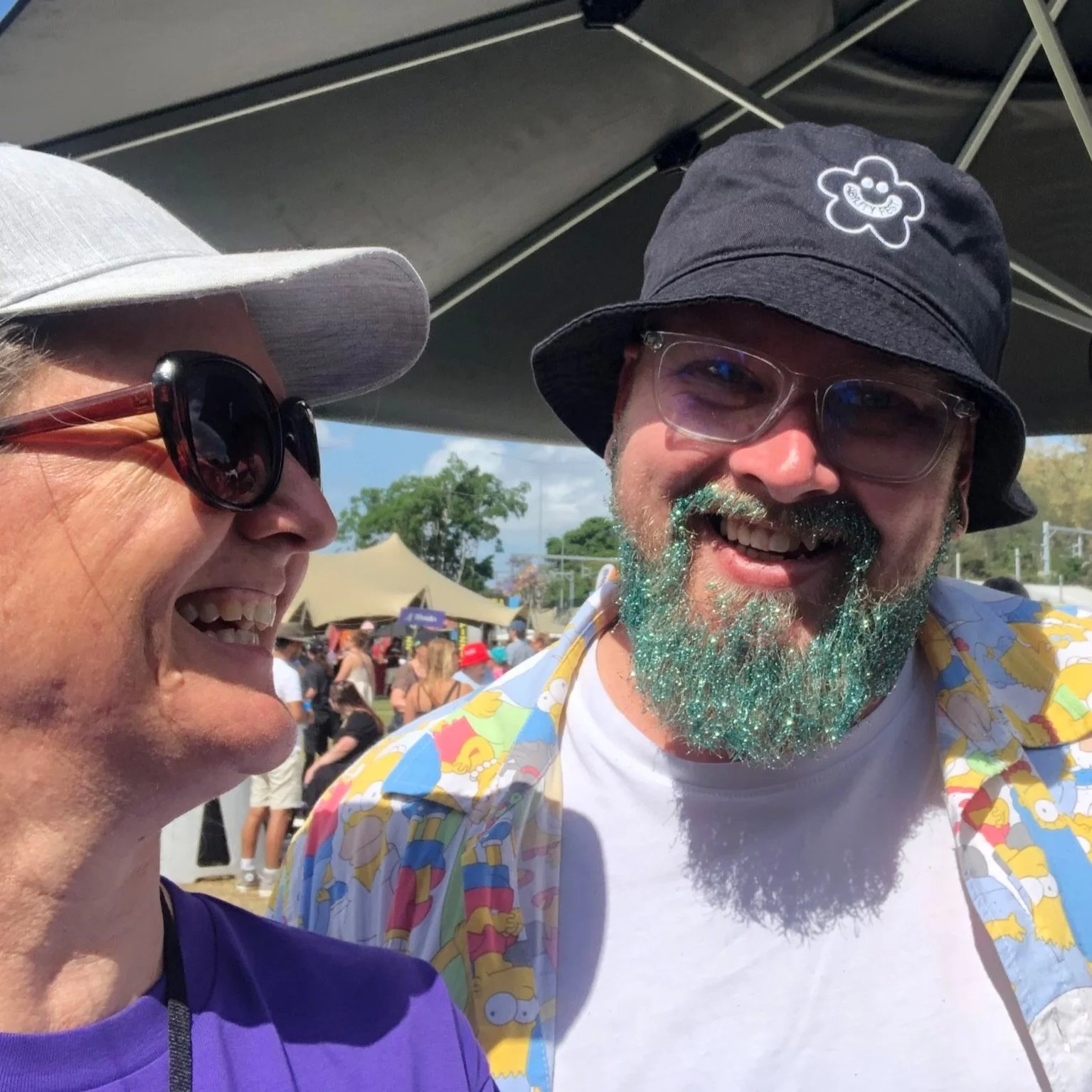 Images: The line for glitter facepainting stretched way back; Kushla with a man with a glittered beard.